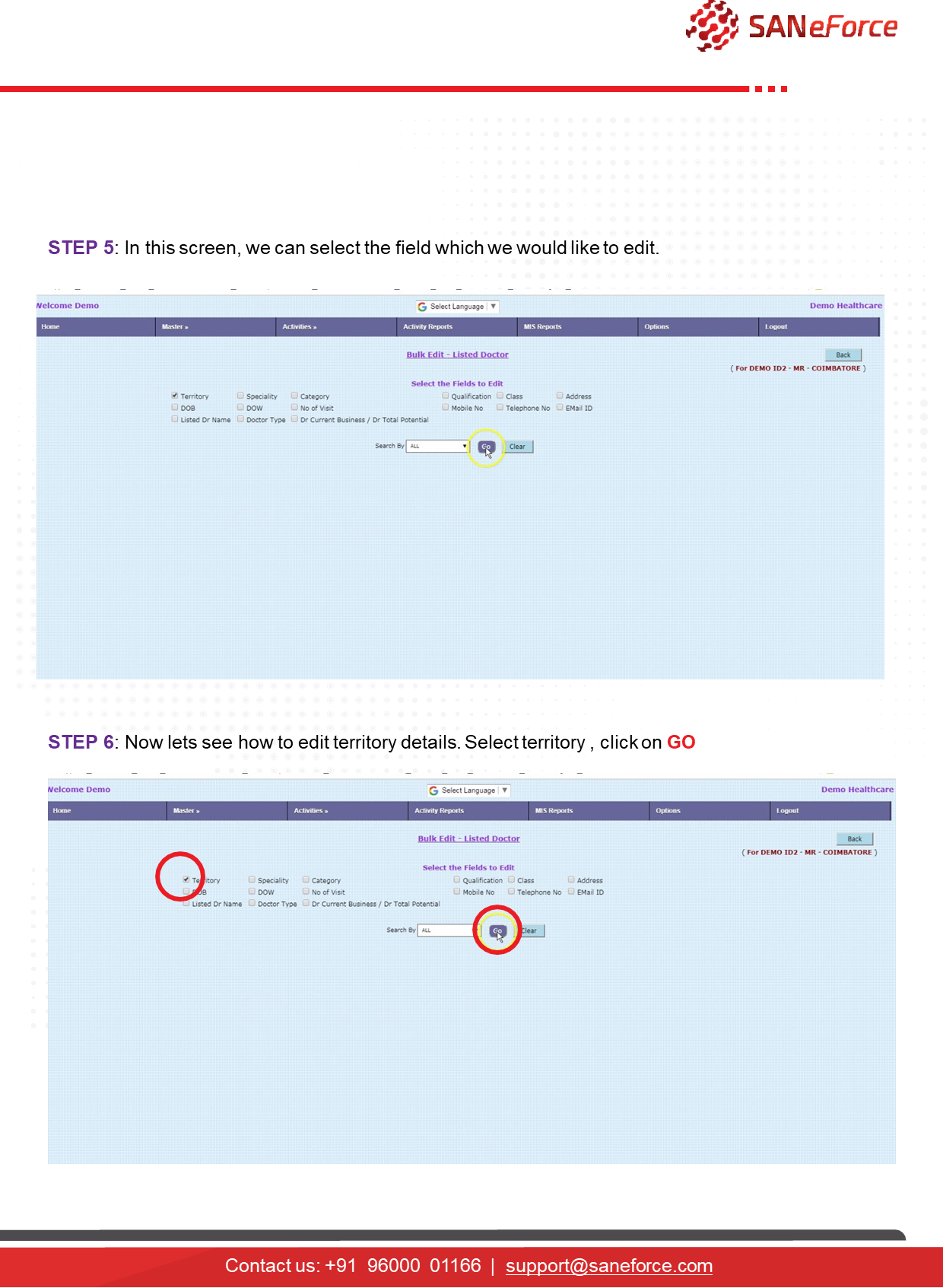 · In Home Page, Scroll down to select “Edit Call”. · Select Date from dropdown on top right corner of the application. · Select the Listed Doctor, Chemist, Stockist and Unlisted Doctor visited on the selected date. · Select “Submit” and now DCR has ...