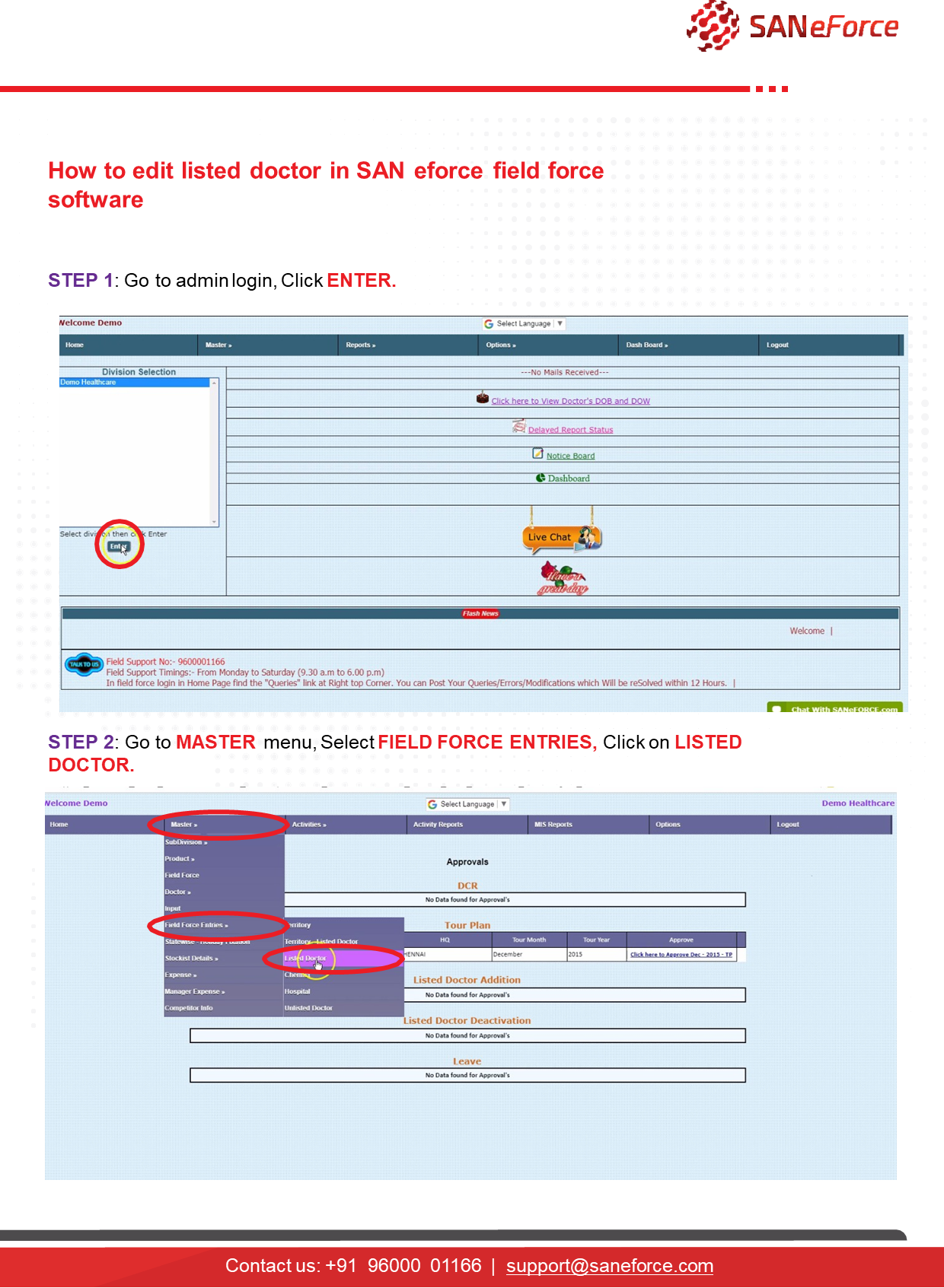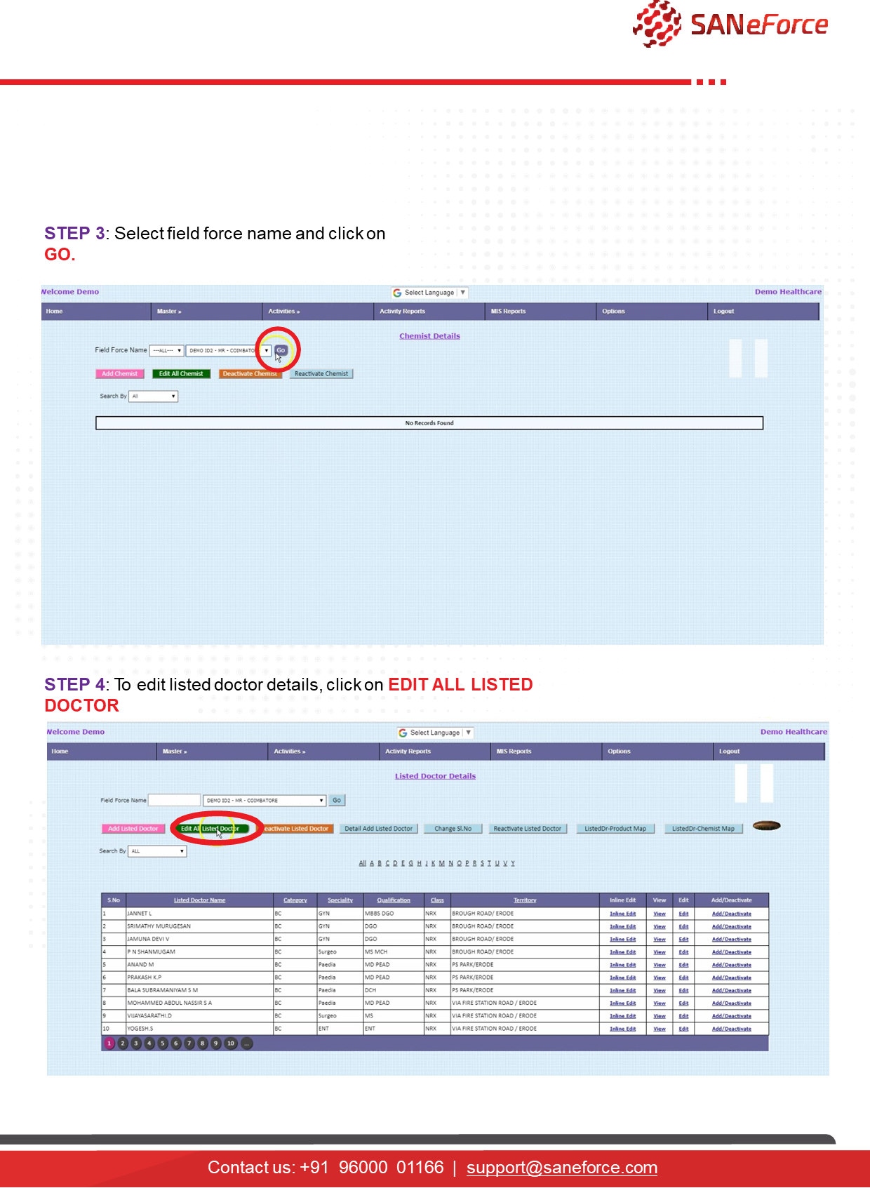 · In Home Page, go to Menu bar by clicking on icon on the top left corner of the application. · Select “Master Sync” · Click on Listed Doctor, Chemist and Chemist to sync them respectively.
