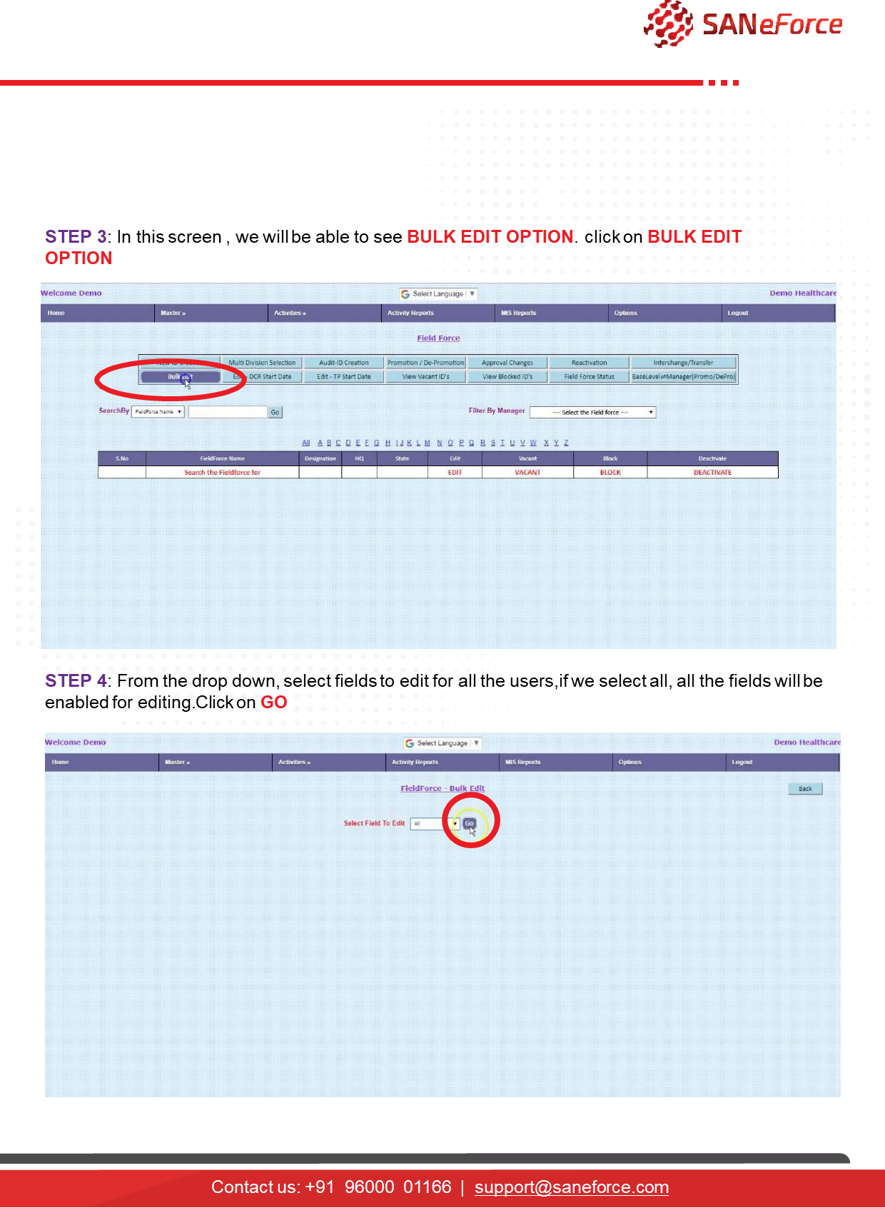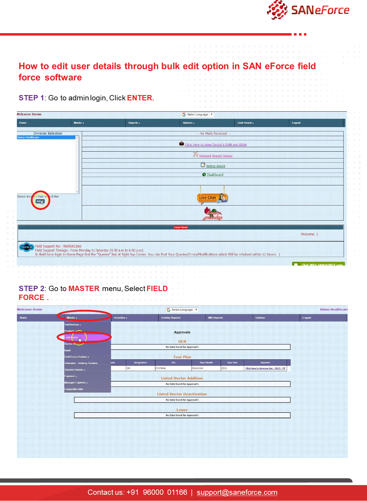 How to activate, edit, view, rejoin and de-active Base Level Vacant ID? "Log into the web application. Once you’re on the dashboard, select the division and click “Enter without Dashboard.” "In this page, under ‘Masters’ menu, select ‘Field ...