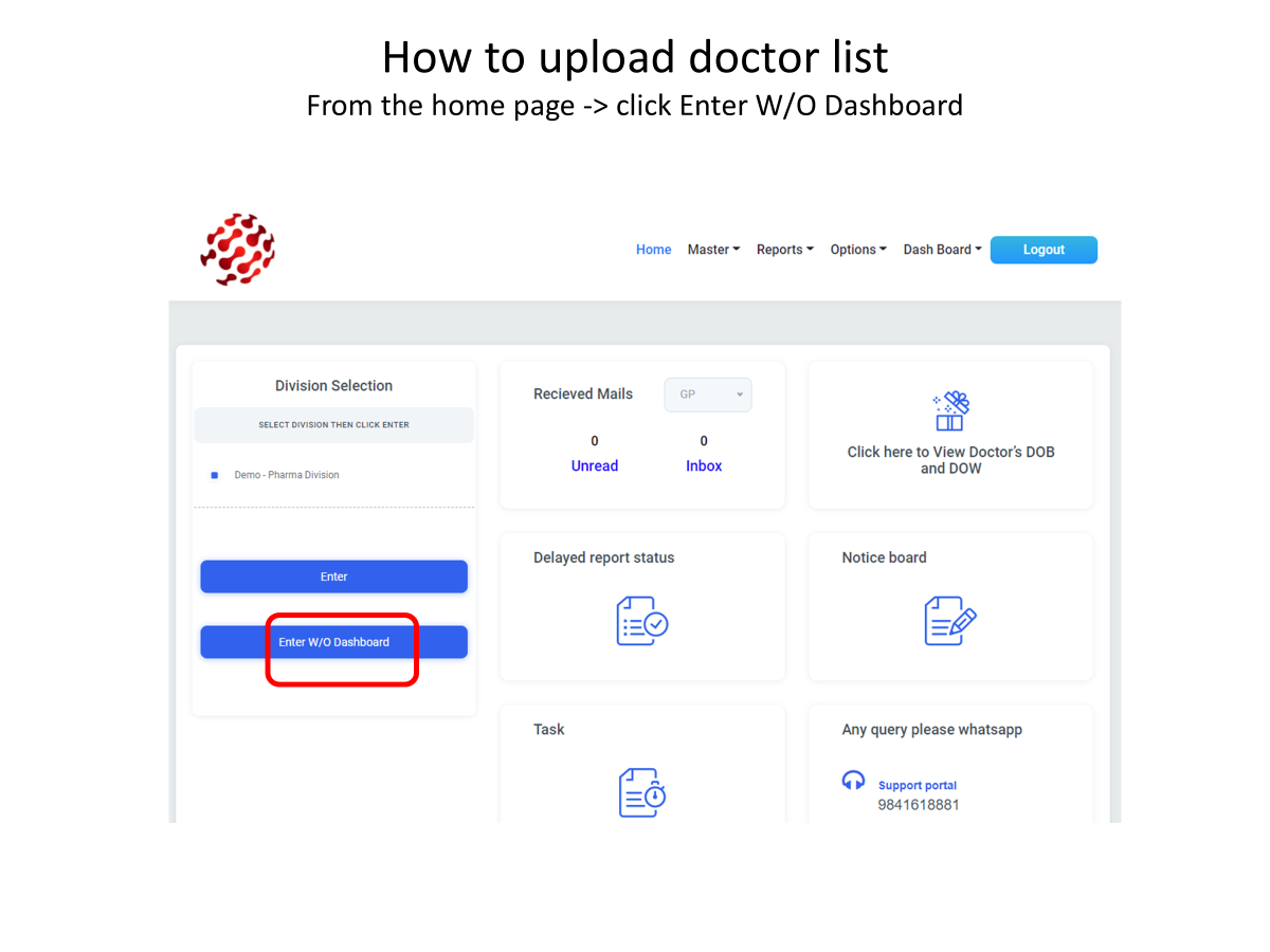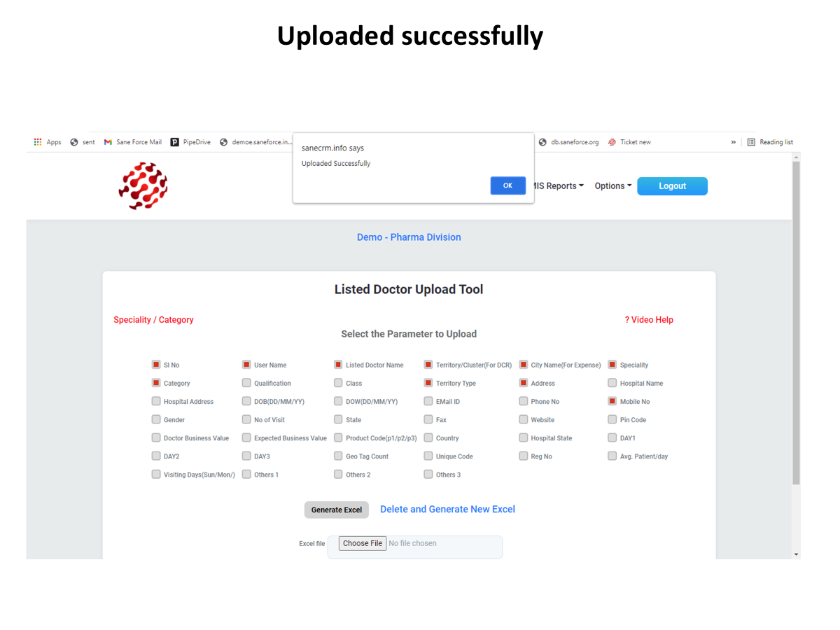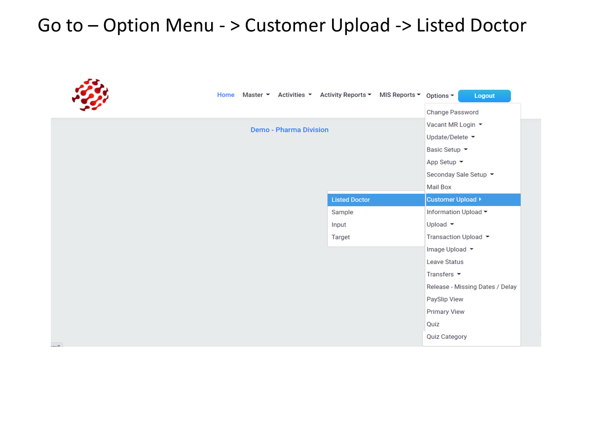 · In Home Page, go to Menu bar by clicking on icon on the top left corner of the application. · Select “Master Sync” · Click on Listed Doctor, Chemist and Chemist to sync them respectively.